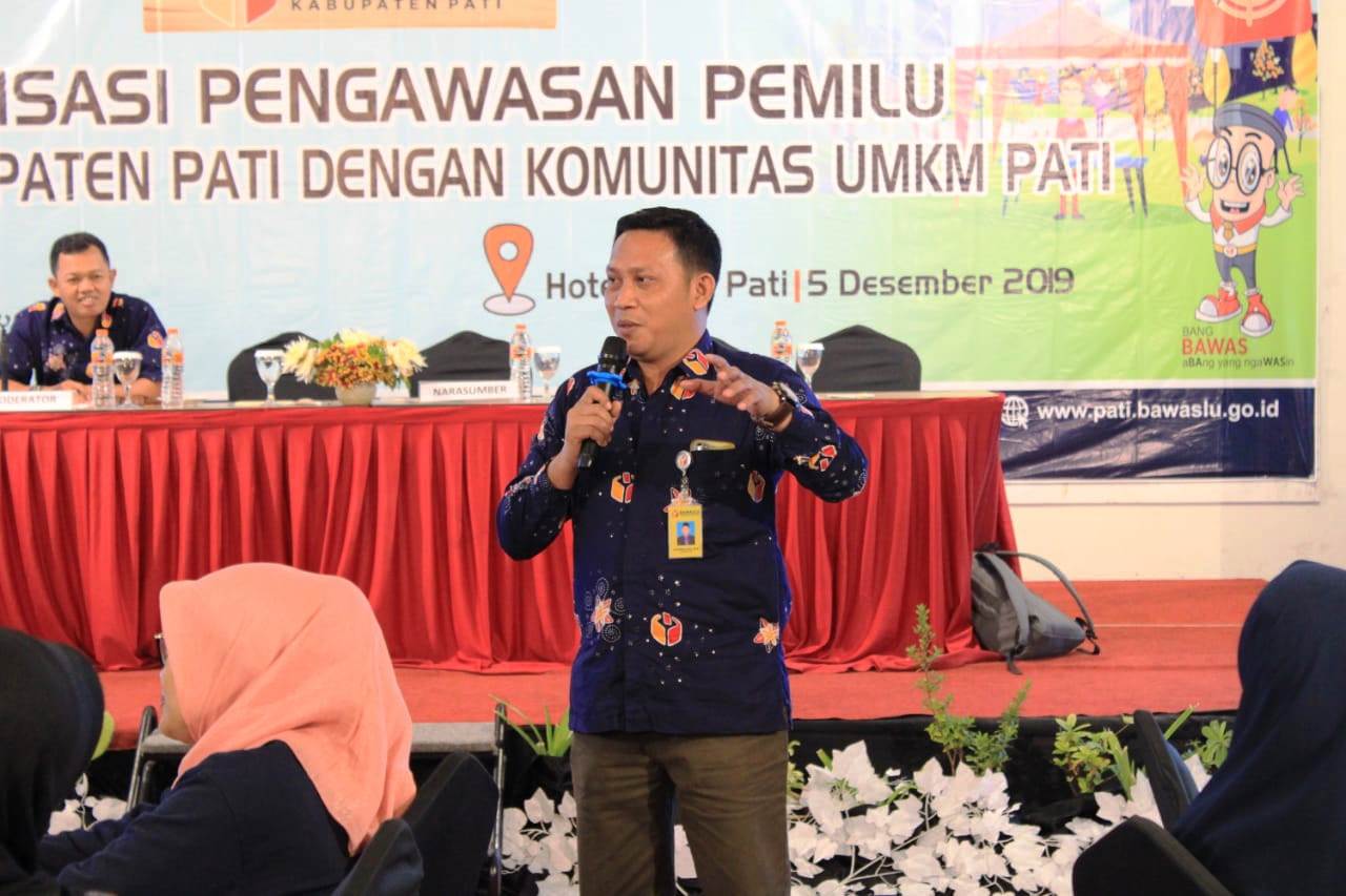 Achwan selaku Kordiv. Hukum dan Datin dalam kegiatan Sosialisasi Pengawasan Pemilu Badan Pengawas Pemilu Kabupaten Pati dengan komunitas UMKM meskipun pemilu sudah selesai dan di Kabupaten Pati juga tidak ada Pilkada, kami mengajak para penggiat UMKM di Kabupaten Pati untuk ikut berpartisipasi dalam melakukan pengawasan partisipatif. Bawaslu mengajak sejumlah Komunitas ataupun organisasi kelompok masyarakat yang ada di Kabupaten Pati, termasuk komunitas UMKM ini untuk ikut andil menjadi mata dan telinga Bawaslu dalam melakukan pengawasan pemilu.