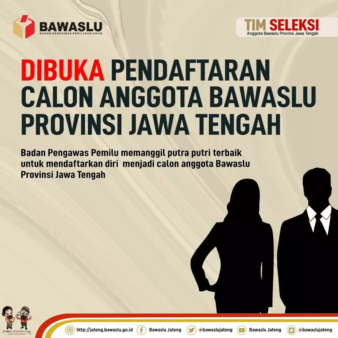- Formulir berkas administrasi calon Anggota Bawaslu Provinsi Jawa Tengah dan keterangan lebih lanjut dapat diperoleh di Sekretariat Tim Seleksi atau melalui laman go.id atau jateng.bawaslu.go.id;