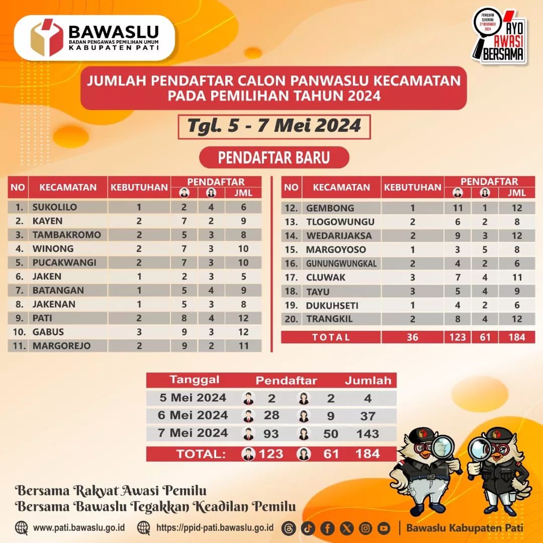 Berdasarkan data yang dikumpulkan oleh Pokja Pembentukan Panwaslu Kecamatan Bawaslu Kabupaten Pati, tercatat ada 143 orang yang mendaftar pada hari terakhir. Angka ini menunjukkan peningkatan yang signifikan daripada hari kedua, Senin (6/5/2024), yang mendaftar 37 orang, sementara pada hari pertama, Minggu (5/5/2024), hanya 4 orang pendaftar.