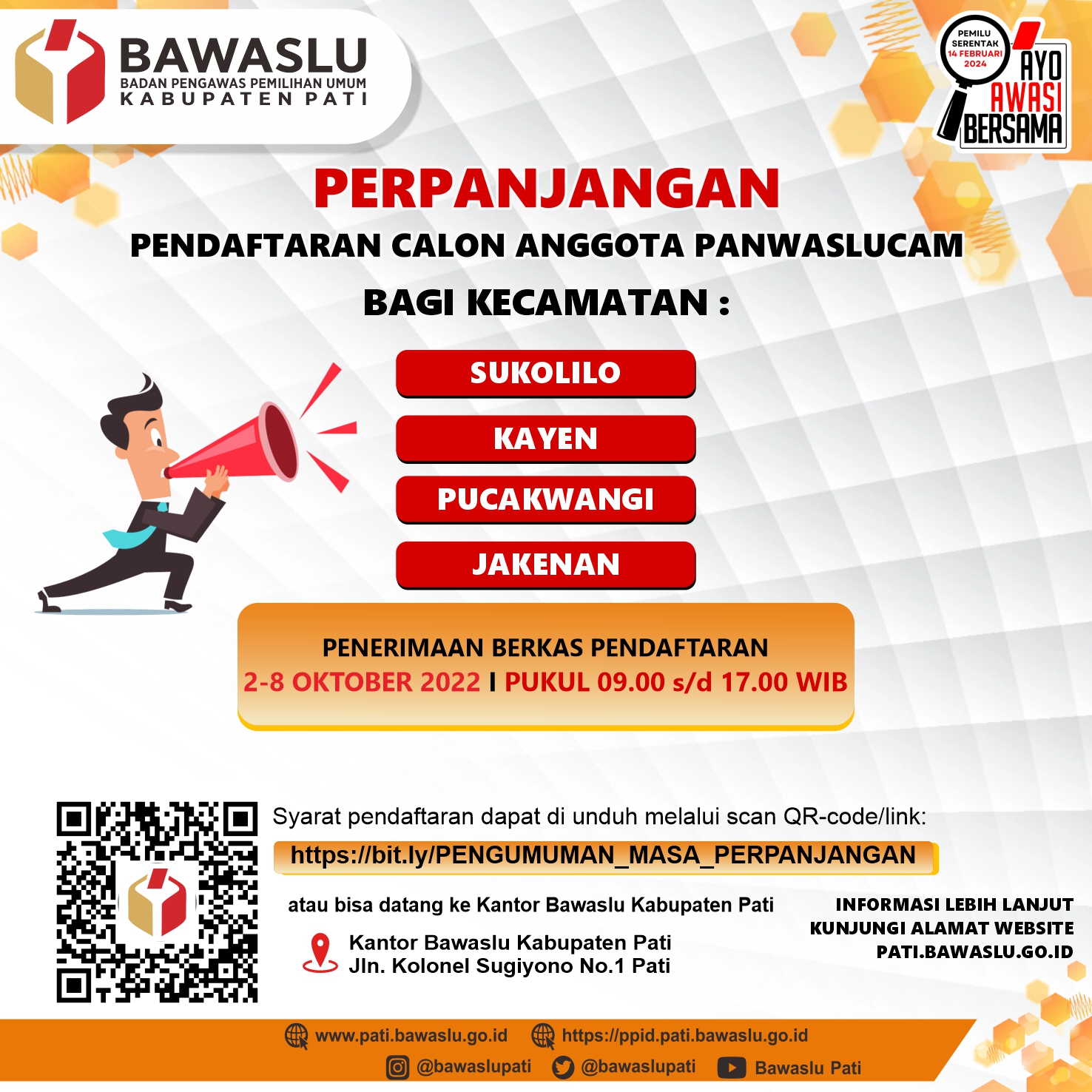 #SahabatBawaslu, Pokja Pembentukan Panwaslu Kecamatan Kabupaten Pati memperpanjang masa pendaftaran Panwaslu Kecamatan dari tanggal 2 s.d. 8 Oktober 2022. Perpanjangan pendaftaran dibuka untuk kecamatan sebagai berikut :