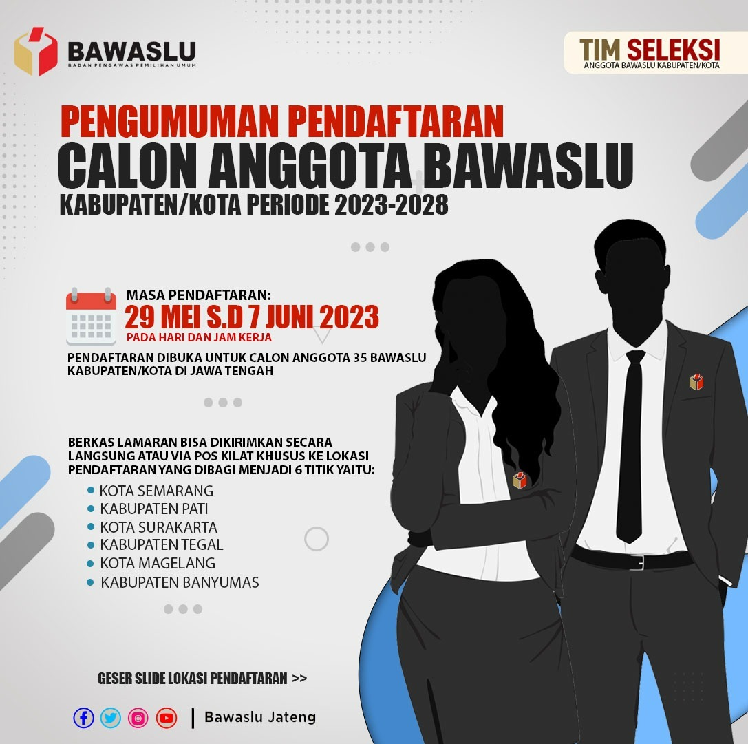 Dalam rangka pembentukan Bawaslu Kabupaten Blora, Kabupaten Grobogan, Kabupaten Jepara, Kabupaten Kudus, Kabupaten Pati dan Kabupaten Rembang maka Tim Seleksi Calon Anggota Bawaslu Kabupaten/Kota Zona II berdasarkan Keputusan Bawaslu Nomor 173/KP.01/K1/05/2023 atas kewenangan yang diberikan oleh Undang-Undang Nomor 7 Tahun 2017 tentang Pemilihan Umum membuka kesempatan bagi Warga Negara Indonesia yang memenuhi persyaratan untuk mendaftarkan diri sebagai calon anggota Bawaslu Kabupaten Blora, Kabupaten Grobogan, Kabupaten Jepara, Kabupaten Kudus, Kabupaten Pati dan Kabupaten Rembang. Adapun ketentuan pendaftaran dapat di unduh/download di bawah ini: